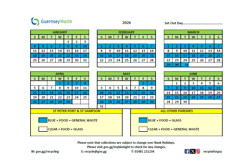 Please see below the 2026 calendars for you to check what waste to put every week.